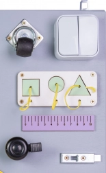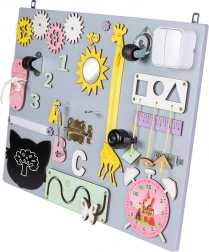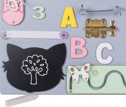 Descoperiți jocul distractiv și educativ cu o tablă manipulativă din lemn, de calitate, pentru copii. Această tablă oferă familiarizare în siguranță cu obiectele de uz cotidian, susține motricitatea fină, abilitățile de coordonare și gândirea logică. Datorită elementelor bine gândite precum fermoar, clopoțel, ceas sau cretă, învățarea prin joc devine distractivă și captivantă.