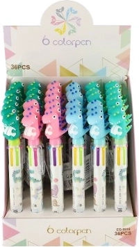Acest pix practic 6‑în‑1 cu topper drăguț de dinozaur combină funcționalitatea cu distracția. Datorită celor șase culori de cerneală, aveți mereu la îndemână culoarea potrivită pentru notițe, subliniere și creație. Comutarea ușoară a culorilor este asigurată de glisoarele separate de pe corpul pixului.