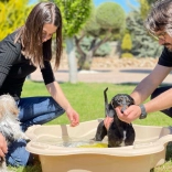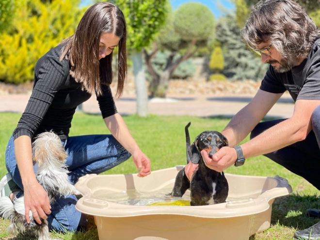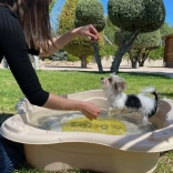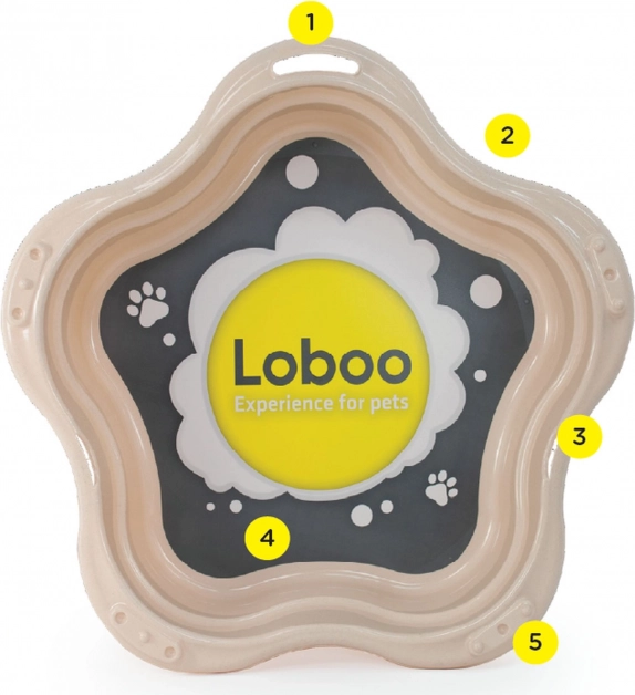 Designul bine gândit, cu margini rotunjite și sigure, previne rosul, în timp ce canalele practice de drenaj împiedică revărsarea. Piscina este stivuibilă pentru economie de spațiu, iar datorită mânerului o puteți transporta comod oriunde – în curte, pe terasă sau în călătorii cu animalele.