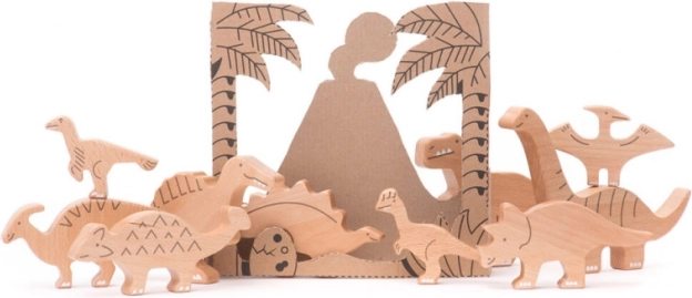 Ambalajul setului este proiectat astfel încât să funcționeze ca un decor pentru jocuri creative. Decupând cartonul de-a lungul liniilor marcate, se creează o scenă preistorică. Jucăriile sunt fabricate din lemn de fag, cunoscut pentru durabilitate și ecologicitate. Joaca și educația merg mână în mână prin materiale naturale.
