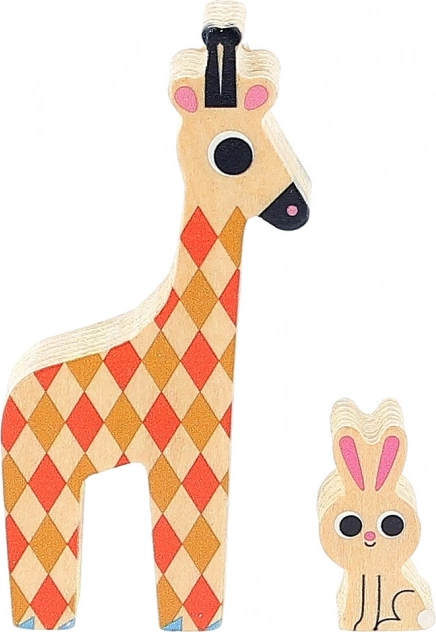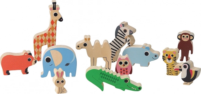 Jocul con1bine o colec1bie variat03 de 12 animale din lemn, pe care copiii le pot stivui și echilibra pe baz03.