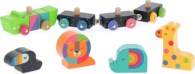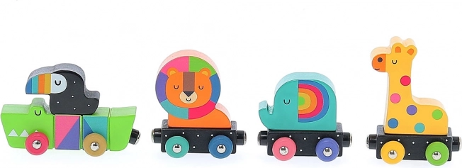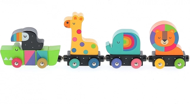 Porniți într-o călătorie creativă cu trenulețul colorat cu animăluțe de la renumitul ilustrator Andy Westface. Acest set unic din lemn include piese cu dimensiuni, forme și culori diverse. Locomotiva și vagoanele, ce reprezintă animale precum crocodilul, leul, elefantul și girafa, sunt ingenios conectate prin magneți. Copiii se vor bucura nu doar de asamblare, ci și de cunoașterea animăluțelor.