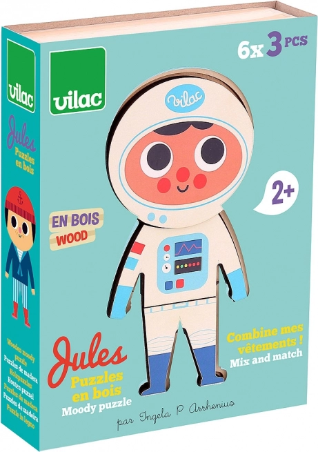 Vilac puzzle îmbrăcăminte Jules este o jucărie din lemn, ideală pentru dezvoltarea motricității, observației și creativității copiilor. Conține 18 piese care permit realizarea a 6 ținute de bază. Copiii pot amesteca piesele individuale pentru a crea un număr nelimitat de combinații: