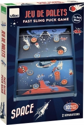 Descoperă jocul de masă din lemn VILAC în stil spațial, care dezvoltă spiritul de observație, precizia și motricitatea fină. Folosește elasticul lateral pentru a lansa discurile și trimite-le prin singura deschidere din centru – sau mărește provocarea cu inserția interschimbabilă cu două orificii. Distracție grozavă pentru toată familia și un look retro original pentru jucători mici și mari. De la 4 ani, execuție din lemn de calitate, joc rapid și dinamic pentru orice masă.