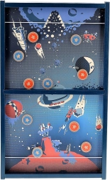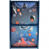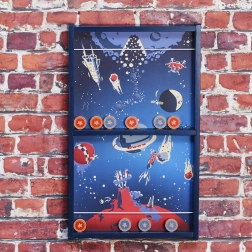 Datorită elementului central interschimbabil alegi cu ușurință dificultatea: o singură deschidere centrală pentru antrenarea preciziei sau o tablă mai solicitantă cu două deschideri excentrice pentru trăgători experimentați. Construcția robustă din lemn, alunecarea lină a discurilor și grafica spațială retro garantează distracție de durată și un aspect stilat al suprafeței de joc.