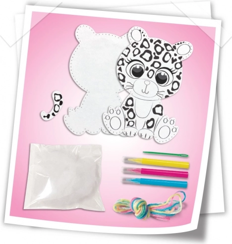 Set creativ pentru cusut și colorat panteră. Coaseți și decorați o jucărie de pluș de 20 × 16 cm. Piese din fetru, umplutură, ațe, ac din plastic, 3 carioci și instrucțiuni.