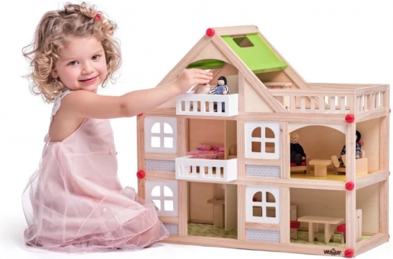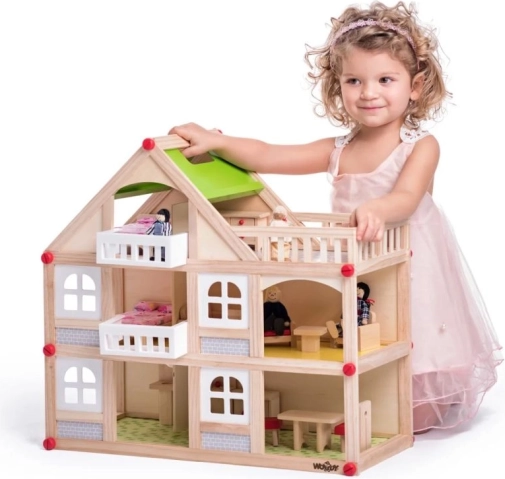Căsuță de păpuși din lemn cu figurine TOOKY TOY, 3 etaje, FSC