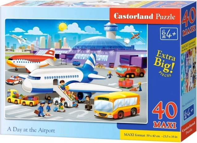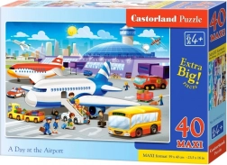 Puzzle maxi colorat pentru copii cu motivul ZIUA LA AEROPORT: 40 de piese mari pentru asamblare ușoară, dimensiune după asamblare 59 × 40 cm. Calitatea Castorland dezvoltă motricitatea fină, concentrarea și imaginația. Potrivit de la 4 ani.
