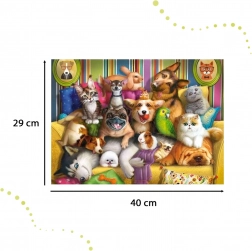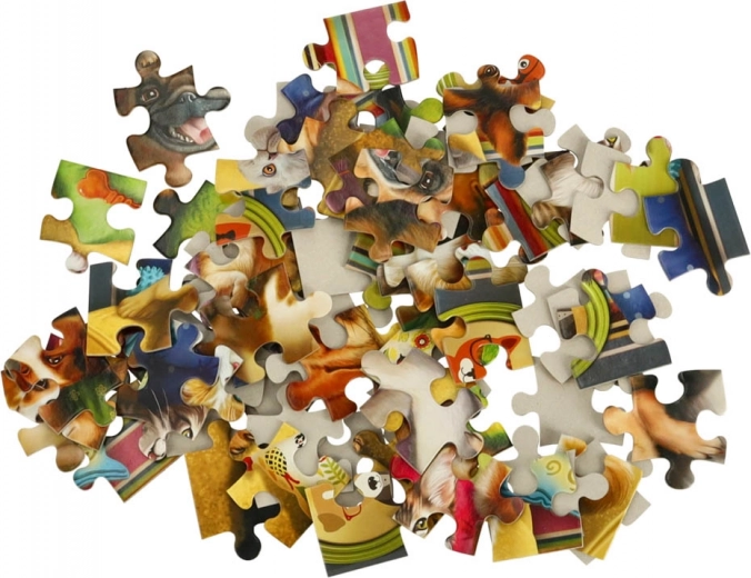 Scenă colorată cu câini, pisici și un papagal, care îi motivează pe copii să asambleze și aduce bucurie cu imaginea finală.