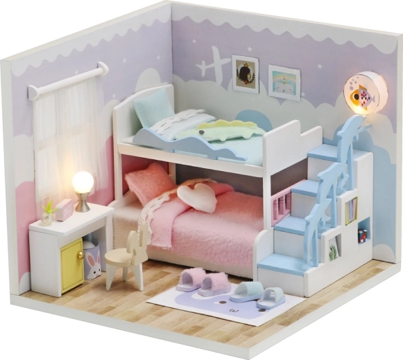 Creează-ți propria lume miniaturală cu dormitorul romantic „Visuri dulci”. Setul oferă momente plăcute la asamblare, lipire și finisarea detaliilor. Modelul final, datorită aspectului său original, va deveni o decorațiune frumoasă pentru cameră sau birou. Setul este livrat demontat și include iluminare LED pentru o atmosferă magică.
