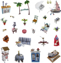 Sunt incluse piese miniaturale de mobilier și decorațiuni – de la hamac și pian până la flori și lămpi. Totul pentru un interior realist și primitor.