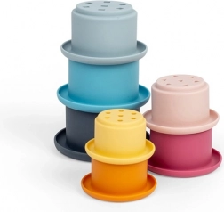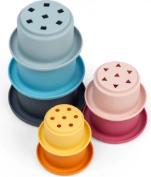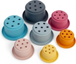 Set colorat de șapte pahare stivuibile din 100% silicon alimentar, fără plastic. Ideal pentru cadă, nisip și pentru acasă. Orificiile cu model din bază creează un efect de cascadă, iar copiii își exersează motricitatea fină, coordonarea ochi–mână și recunoașterea culorilor. Materialul este rezistent, netoxic, se curăță ușor și poate fi spălat în mașina de spălat vase.