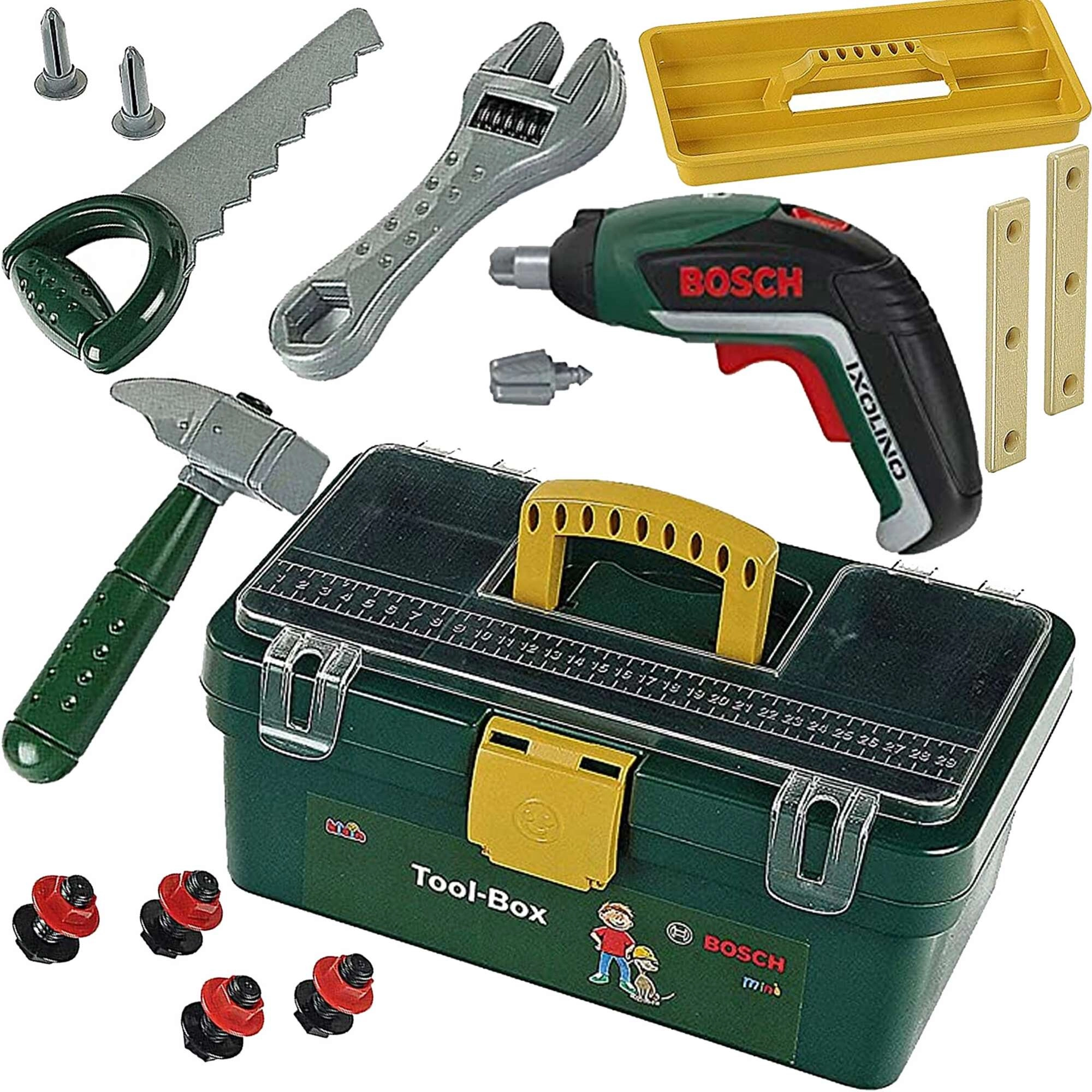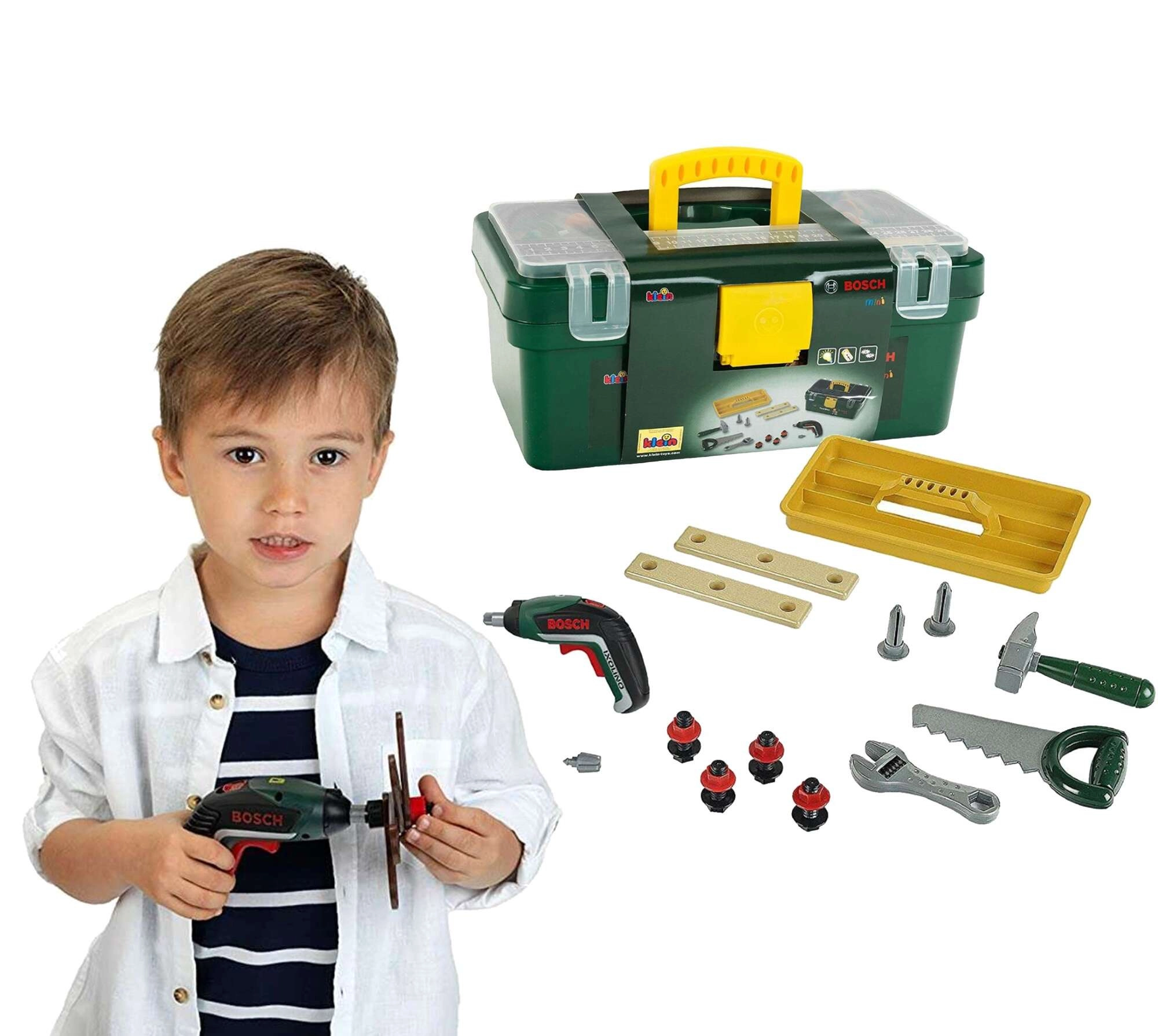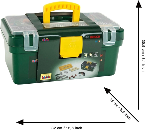 Geantă cu unelte pentru copii de la KLEIN, în design licențiat BOSCH, care oferă un joc de reparat sigur și distractiv. Geanta practică, de culoare verde închis, cu mâner galben și capac transparent, ascunde un set bogat de unelte, inclusiv bormașina fără fir IXOLINO II cu rotație stânga/dreapta, fierăstrău, ciocan, cheie franceză, șuruburi și plăcuțe de construcție. O alegere excelentă pentru dezvoltarea motricității, creativității și a jocurilor de role-play pentru copiii de la 3 ani în sus.