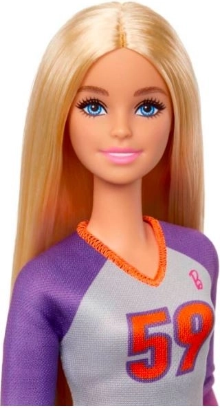 Îmbrăcată în top violet-gri și șorturi, cu numărul 59, această păpușă aduce elemente de modă și sport.