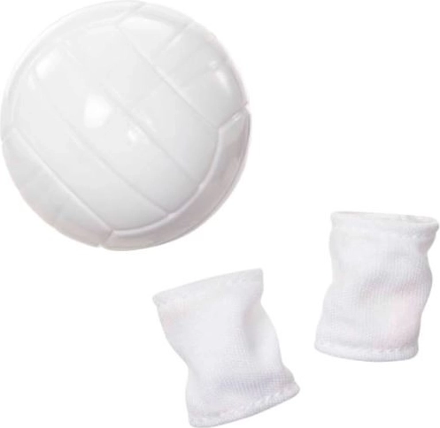 Setul include o minge de volei albă și două brățări asortate, care completează aspectul sportiv al păpușii.