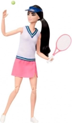 Păpușa Barbie Cariera Tenis are 22 de articulații, permițând copiilor să trăiască fanteziile sportive. Poartă o ținută sportivă alcătuită dintr-un top alb cu accente albastre și o fustă roz, completată cu o șapcă de tenis.