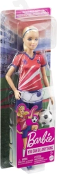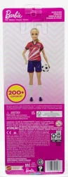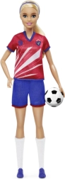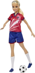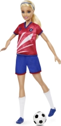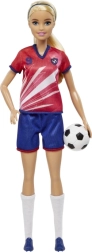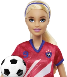 Păpușa Barbie fotbalistă îi inspiră pe copii la joacă activă și creativă. Are păr blond lung prins în coadă, tricou roșu cu dungi albe și numărul 9, emblema echipei, șort albastru, ghete de fotbal și șosete albe înalte. Împreună cu mingea inclusă, este pregătită pentru antrenament și pentru marele meci.