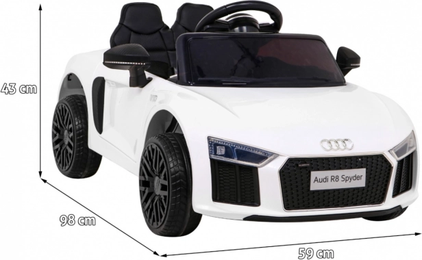 Mașinuța electrică pentru copii, licențiată după AUDI R8 Spyder, impresionează prin detalii realiste, telecomandă 2.4G pentru condus în siguranță, roți moi din EVA și pornire lină. Datorită farurilor LED, panoului MP3/USB/SD/AUX și scaunului din eco-piele cu centuri de siguranță, oferă o experiență confortabilă și distractivă atât acasă, cât și afară.