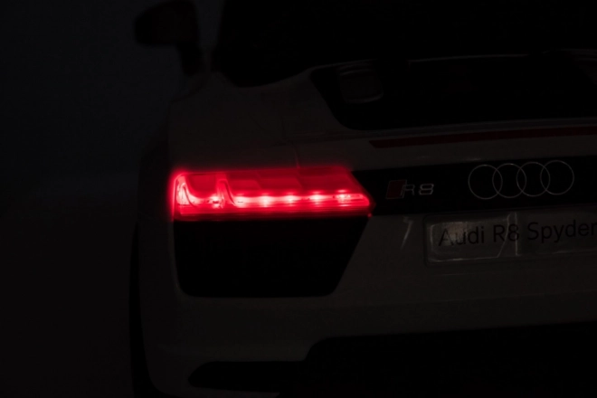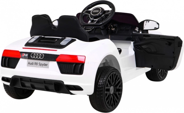 Faruri LED față și spate, panou MP3/USB/SD/AUX și butoane pe volan. Uși care se deschid și elemente autentice ale modelului AUDI R8 încântă orice copil.