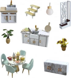 Canapea confortabilă, scaun suspendat, masă elegantă și o pisicuță adorabilă cu un stâlp de zgâriat – fiecare piesă este concepută cu precizie pentru un aspect realist al interiorului.