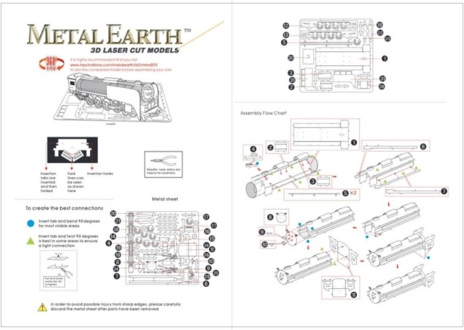 Setul METAL EARTH din foi de oțel aduce o replică realistă a unei locomotive cu abur. Piesele sunt decupate cu precizie și, datorită gravorii laser detaliate, creează un aspect autentic. Asamblarea necesită răbdare și îndemânare, dar răsplata este o piesă de artă care va încânta orice pasionat de tehnică și căi ferate.