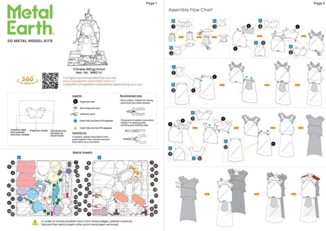 Scoateți piesele individuale din foile metalice; dacă este necesar, folosiți cleștișori tăietori mici (nu sunt incluși). Piesele se îmbină între ele cu ajutorul unor încuietori formate dintr-un cârlig (cioc) și o fantă. Îndoiți cârligul cu ajutorul unei pense mici și subțiri (nu este inclusă) și îmbinați treptat toate încuietorile până când ia naștere o piesă de mare realism!