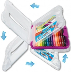 Carcasa inteligentă din plastic, cu mecanism cu pârghie, facilitează organizarea și alegerea rapidă a culorii. Setul este ideal pentru școală, ateliere și acasă – aveți mereu totul la îndemână.