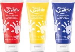Setul include trei tuburi de culori pentru degete în nuanțe vii – roșu, galben și albastru. Culorile sunt netoxice și sigure pentru copiii mici.
