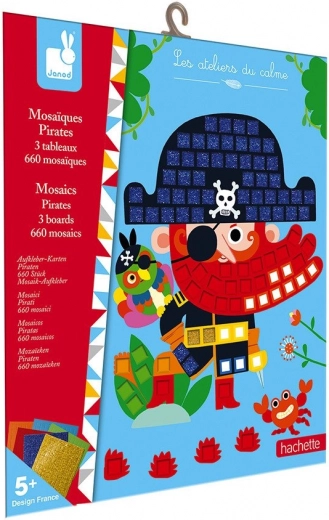 Mozaic pentru toți micii pirați. Un mozaic frumos cu imagini viu colorate conține 6 foi cu autocolante mozaic strălucitoare și colorate. Mozaicul susține dezvoltarea tactilă a copilului. În set sunt 3 imagini cu pirați (dimensiuni 25 x 21 cm). Potrivit pentru copii de la 5 ani. Setul Janod Atelier pentru creație sprijină abilitățile și imaginația copiilor. Jucăriile creative pentru copii nu ocupă mult spațiu, sunt potrivite atât pentru călătorii, cât și pentru acasă, în sănătate și boală, și îi distrează pe copii ore întregi. Crearea prin diverse tehnici sprijină focalizarea și concentrarea, explorarea firească și abilitățile artistice.