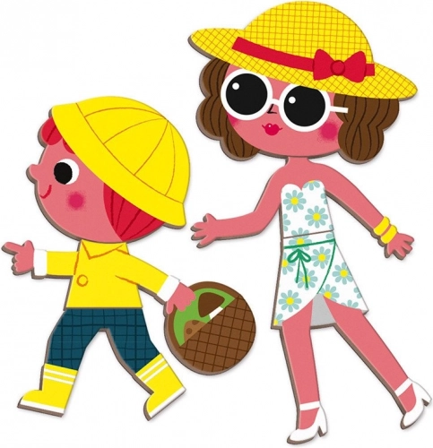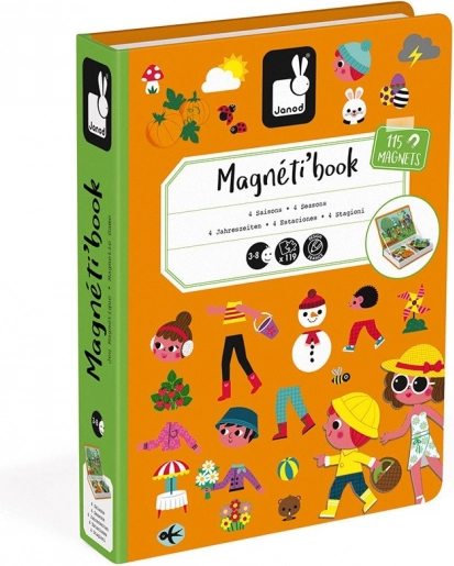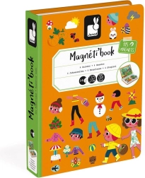 Cartea magnetică Janod Magnetibook – anotimpuri dezvoltă imaginația, gândirea logică și motricitatea fină. Copiii, după carduri, compun scene ale fiecărui anotimp și aleg îmbrăcămintea și accesoriile potrivite. Datorită formatului compact în formă de carte, este ideală pentru călătorii, în mașină și în vizite.