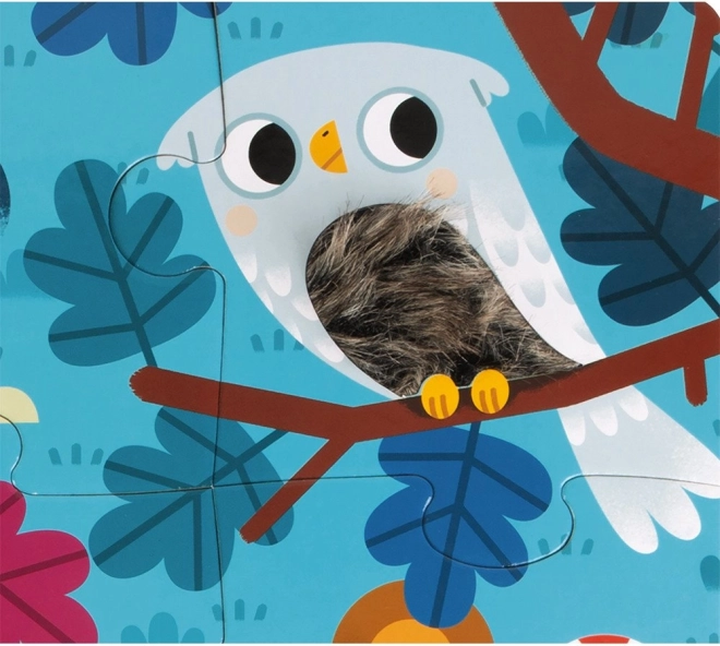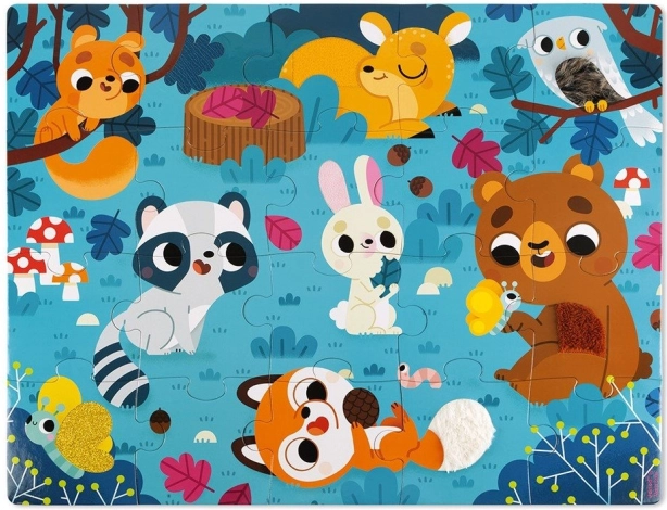 Descoperiți puzzle-ul tactil distractiv cu tematică de animale din pădure de la JANOD. Unele piese au finisaj special de suprafață pentru dezvoltarea simțurilor – blăniță, sclipici, catifea și altele. Pachetul include și un poster pentru asamblare mai ușoară. Puzzle-urile susțin în mod natural gândirea logică, atenția, memoria și motricitatea fină a copiilor.