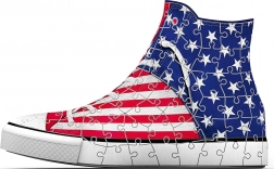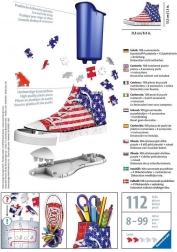 O combinație genială pentru iubitorii de adidași și de puzzle-uri! Asamblează un puzzle 3D cu o formă inedită, care îți va înveseli biroul... RAVENSBURGER a început producția de adidași 3D ce pot fi folosiți ca suporturi originale pentru pixuri, creioane sau chiar pensule. Piesele speciale, curbate sau flexibile, care se îmbină perfect la locul lor, permit construirea unui adidaș de design cu imprimeu al steagului american, cu un aspect foarte realist. Piesele sunt realizate din plastic solid și oferă o stabilitate excelentă. Adidașul se menține fără a fi nevoie de lipire. Pachetul conține: 108 piese de puzzle numerotate, 4 piese de accesorii și instrucțiuni. Conținutul adidașului ilustrat în fotografie nu este inclus în pachet. Dimensiunea puzzle-ului asamblat aprox. 21,4 x 13,5 cm
