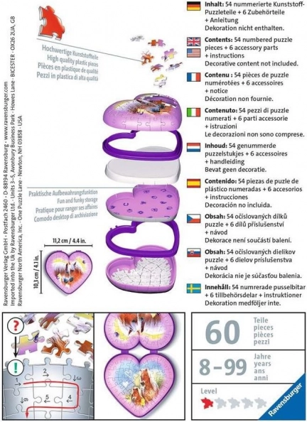 Descoperiți farmecul puzzle-urilor 3D RAVENSBURGER: din piese fabricate cu precizie, curbate și flexibile, veți asambla o casetă de bijuterii impresionantă în formă de inimă, cu un delicat motiv cu cai. Construcția este stabilă, se menține ferm fără adeziv și, după asamblare, servește drept decorațiune funcțională și frumoasă pentru camera copiilor.