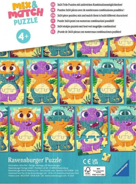 Descoperă distracția cu RAVENSBURGER Mix & Match: dinozauri drăgălași, cu 3 puzzle-uri a câte 24 de piese. Copiii pot asambla după model sau pot mixa și combina piesele între cele trei imagini pentru a crea personaje de dinozauri amuzante. Execuția de calitate și piesele ușor de prins îi vor încânta pe micii constructori.