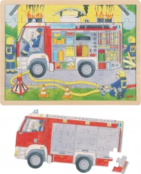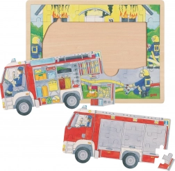 Descoperiți un puzzle din lemn multistrat distractiv și educativ, cu tema pompierilor la lucru. Se asamblează pe o placă de bază practică cu margine înălțată și oferă 2 straturi – autospeciala de pompieri la sosire și în timpul intervenției. Copiii își extind prin joacă cunoștințele despre echipamentul și dotările pompierilor și își exersează motricitatea fină, logica și răbdarea.