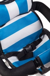 Centurile de siguranță mențin copilul în poziția corectă pe scaun, iar protecția specială dintre picioare previne alunecarea. Dacă micuțul nu ajunge la pedale, își poate sprijini picioarele pe suporturile rabatabile, care pot fi pliate pentru a nu incomoda la pedalare.