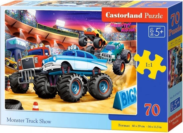 Puzzle colorate pentru copii Monster Truck Show cu 70 de piese îi vor încânta pe micii constructori. După asamblare, rezultă o imagine de 40 × 29 cm. Execuția de calitate și culorile vii susțin distracția și învățarea – asamblarea dezvoltă motricitatea fină, concentrarea și imaginația.