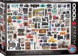 EUROGRAPHICS Puzzle Lumea aparatelor foto oferă un design unic și o provocare deosebită. Datorită formei neobișnuite a pieselor, care nu urmează o grilă standard, veți experimenta o asamblare mai complexă.