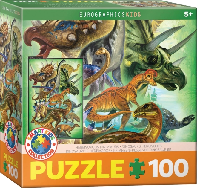 Puzzle pentru copii EUROGRAPHICS cu tematică de dinozauri ierbivori aduce distracție isteață pentru micii iubitori ai preistoriei. Conține 100 de piese, este potrivit de la 5 ani, după asamblare are dimensiunea 33 × 48,3 cm și este ambalat într-o cutie pătrată compactă.