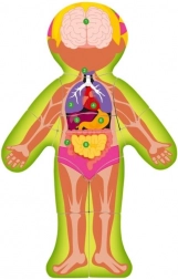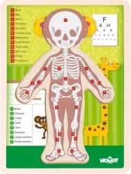 Acest puzzle din lemn de calitate dezvoltă imaginația copilului, motricitatea fină și gândirea logică. Copilul potrivește douăsprezece piese cu imaginea unei fete, iar pe verso găsește organele umane marcate. Imaginea de bază reprezintă scheletul uman și conține o listă numerotată a organelor și oaselor – un excelent punct de pornire pentru primele noțiuni de anatomie în limba engleză.