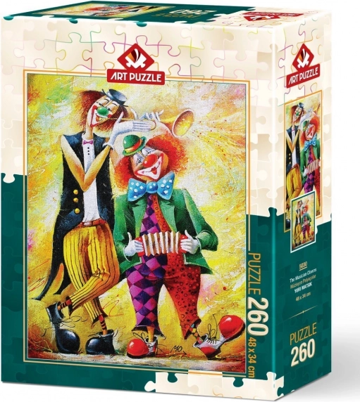 Puzzle vesel cu motiv de clovni de la marca ART PUZZLE oferă 260 de piese și, după asamblare, are dimensiunea aprox. 34 × 48 cm. Producătorul oferă, de asemenea, serviciul de trimitere a piesei lipsă – dacă motivul este încă în ofertă și furnizați numărul lotului de producție.