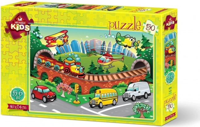 Faceți-le copiilor o bucurie cu un puzzle colorat cu motiv de transport. Imaginea cu mașini, autobuze și alte vehicule îi va distra pe cei mici și le va dezvolta abilitățile. Datorită celor 50 de piese, asamblarea este moderat provocatoare și potrivită pentru micii începători în ale puzzle-urilor.