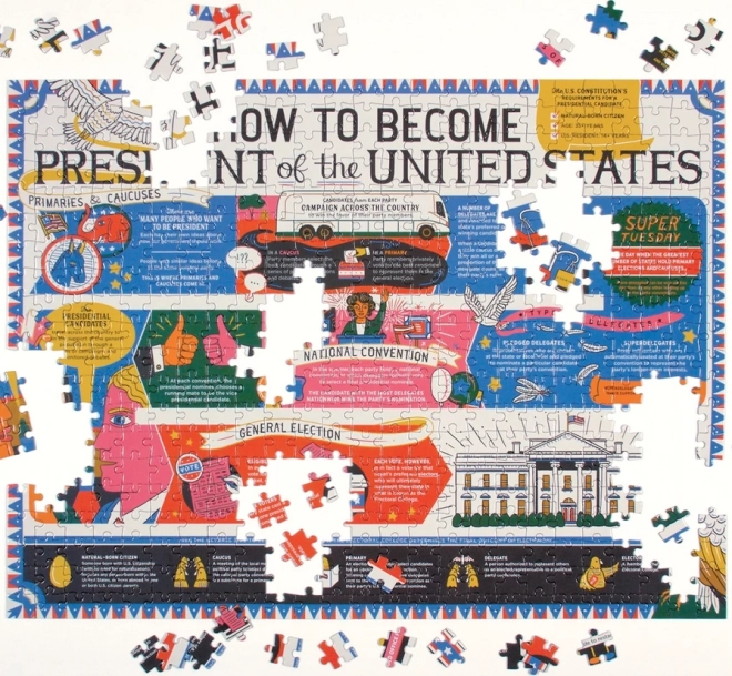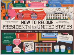 Acest puzzle dublu față de la GALISON oferă distracție dublă. Pe o parte suprafața este lucioasă, pe cealaltă mată, ceea ce ușurează diferențierea motivelor și crește confortul la asamblare. Tema te conduce prin reperele alegerilor prezidențiale din SUA – de la alegerile primare, prin nominalizări, până la alegerile finale.