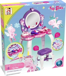 Măsuță de toaletă stilată pentru copii, cu imagini cu unicorni, ideală pentru toate micuțele cochete. Oferă un set bogat de accesorii, un taburet confortabil și o execuție sigură pentru copii de la 3 ani. Datorită designului jucăuș, susține creativitatea, imaginația și jocul de rol în distracția de zi cu zi.