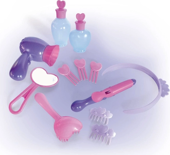 - 12 accesorii – flacoane, uscător, bentiță, agrafe și altele pentru un joc realist.