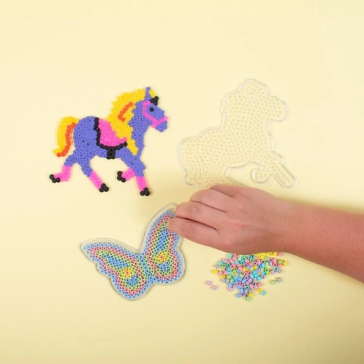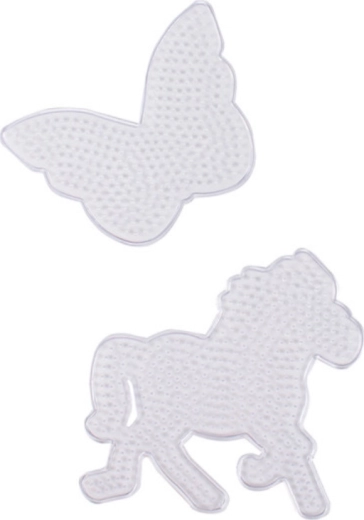 Creează imagini colorate din mărgele termoadezive cu șabloanele practice PLAYBOX. Materialul transparent îți permite să pui sub șablon un model (nu este inclus în pachet) și să îl urmezi comod. Setul conține două forme îndrăgite – fluture și cal – care îi vor încânta pe creatori, mici și mari.