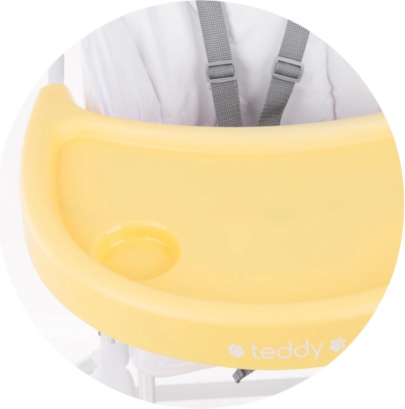 Scaunul de masă CHIPOLINO Teddy, ușor și stabil, oferă un tăviță spațioasă, un șezut larg și confortabil, centuri de siguranță în 5 puncte și pliare rapidă pentru depozitare facilă. Ideal pentru copiii care pot sta deja singuri în șezut.