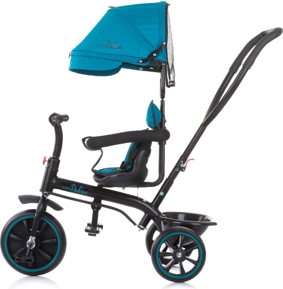 Tricicletă pentru copii 2în1, care crește odată cu copilul cu mâner de ghidare pentru părinți, baldachin detașabil și scaun larg și confortabil. Se transformă ușor din modul asistat într-o tricicletă pentru condus independent. Include bară de siguranță, suport pliabil pentru picioare și un coș posterior practic pentru mărunțișuri.