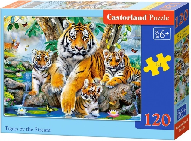 Realizați o imagine uimitoare Tigrii la pârâu cu ajutorul acestui puzzle de 120 de piese. Este ideal pentru copiii cu vârste de la 6 ani, care caută provocări mai complexe.