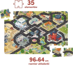 Descoperă orășelul aglomerat și locuitorii săi cu aceste puzzle-uri mari de podea. Pregătește mașinuțele de jucărie și pornește pe drumuri! Planifică-ți propriul traseu și vizitează locurile preferate. Ilustrațiile pline de umor și detalii inspiră jocul creativ. Invită frații și prietenii și bucurați-vă de momente împreună!